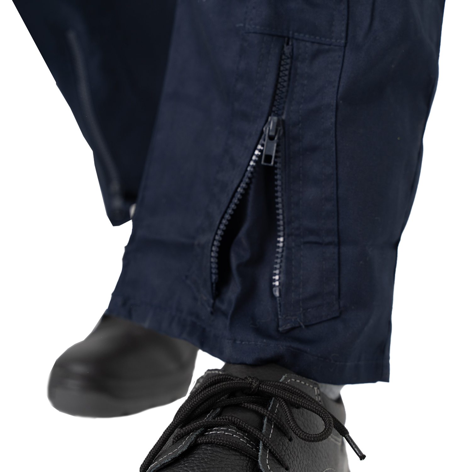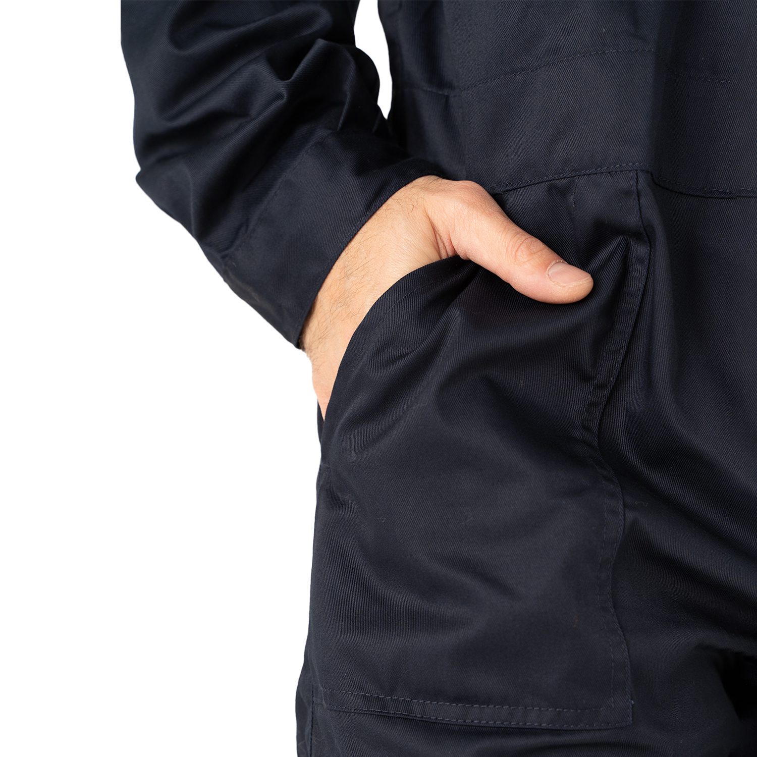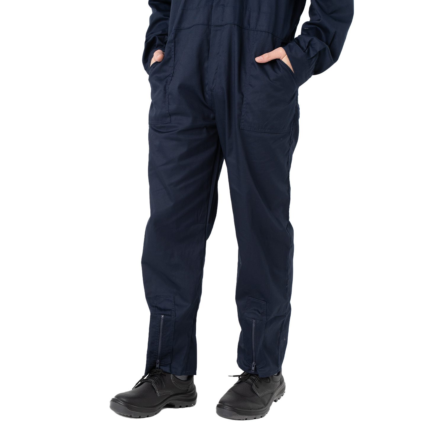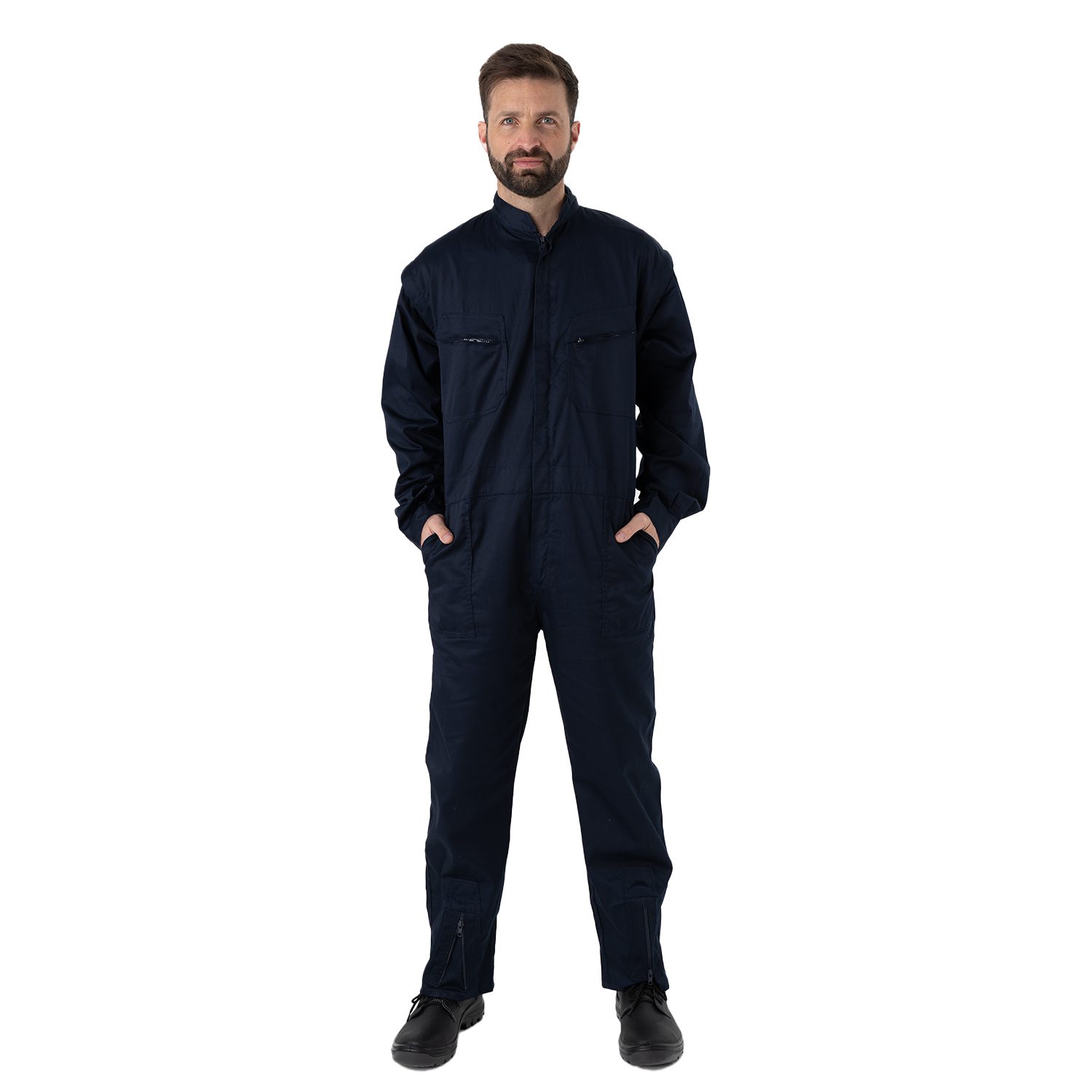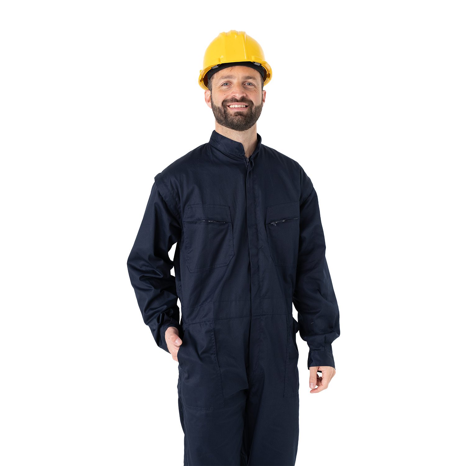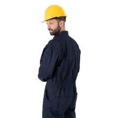 Mameluco ideal para uso industrial, cerramiento delantero con cierre metálico, dos bolsillos laterales y dos bolsillos en pectorales con cierre metálico, elástica en la parte baja de la espalda y dos bolsillos traseros.